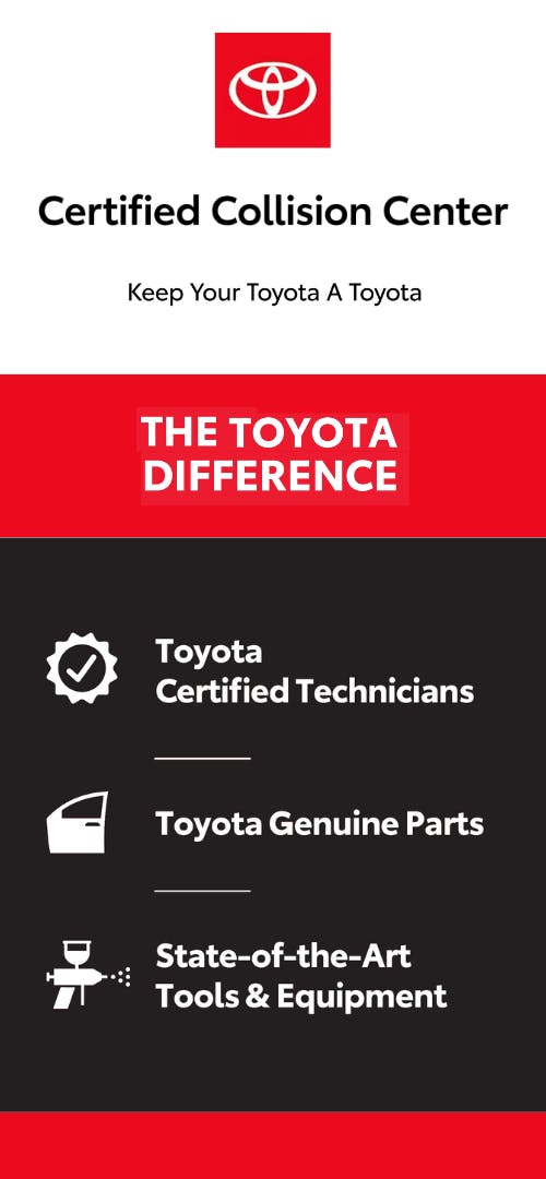 Toyota is an industry leader when it comes to customer satisfaction and standing behind its product. This is why Toyota Certified Collision Centers like ours are crucial -- they uphold the highest standards of excellence to ensure auto repairs are reliable and properly handled. The goal is to get your RAV4 or Camry back to pre-collision condition, so you can enjoy your ride again.